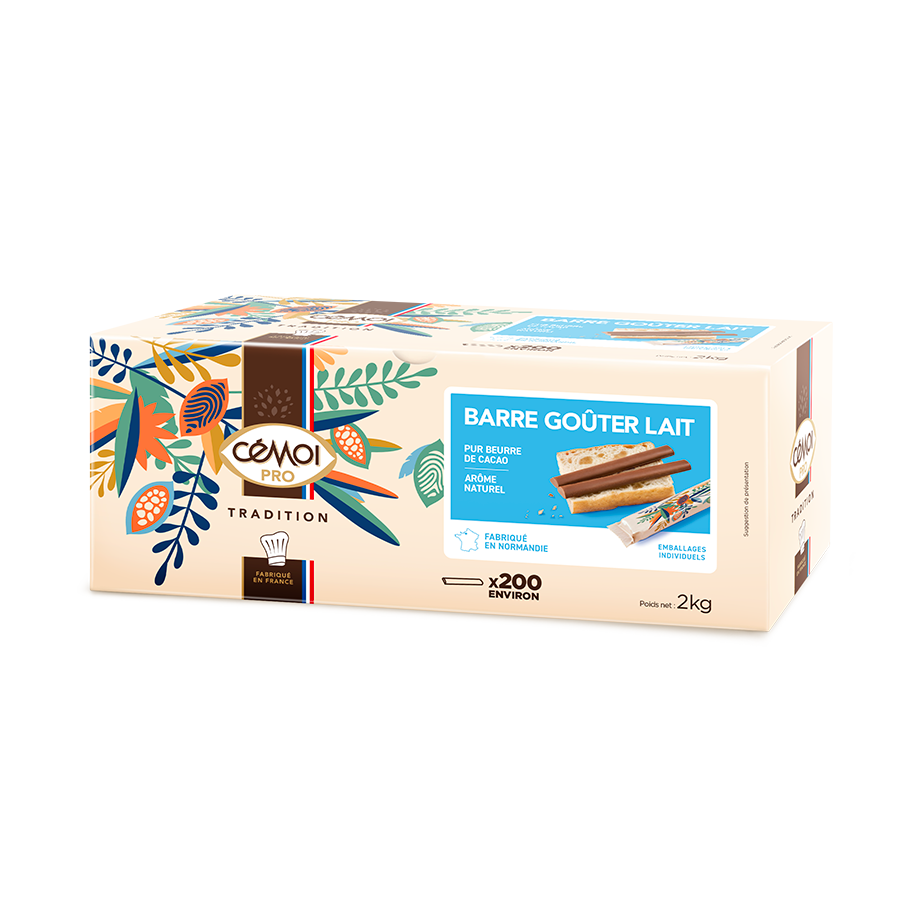 L’essentiel du goût, dans une barre pratique et engageante La Barre Goûter Cémoi Pro combine authenticité, simplicité et praticité. Fabriquée en Normandie, elle est élaborée à partir de chocolat pur beurre de cacao sans arôme artificiel, pour un plaisir chocolaté sincère, parfaitement adapté aux collectivités, boulangeries, reconditionneurs ou professionnels du CHR. Habillée d’un flowpack attractif, elle élargit ses usages : de la cantine au café, du goûter à la vitrine. Disponible en : carton vrac environ 200 barres par étui, soit 2 kg