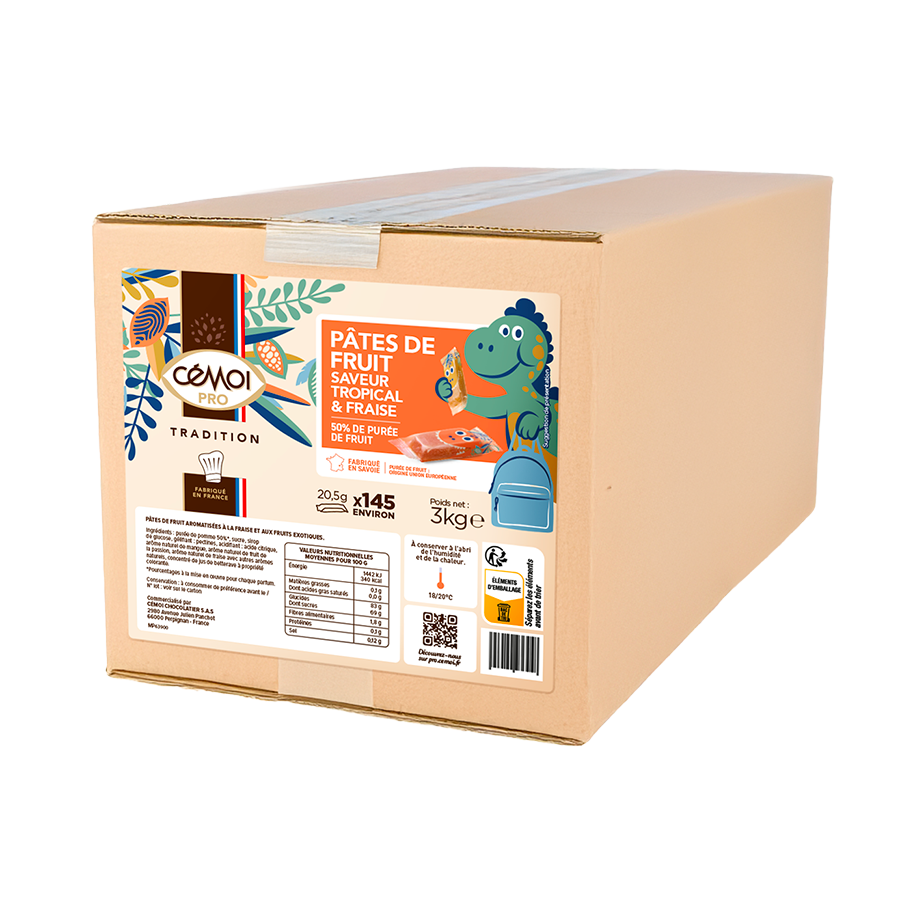 Une douceur fruitée qui fait sourire… et plaisir ! Cémoi Pro lance une nouveauté pensée pour les distributeurs de goûters et les professionnels du reconditionnement : des pâtes de fruits ludiques, emballées individuellement dans un flowpack aux couleurs de dinosaures rigolos. Fabriquées en Savoie, elles contiennent 50 % de pulpe de fruits et offrent une vraie pause gourmande, colorée et pratique. Avec son format individuel et sa fabrication française, cette pâte de fruits combine plaisir, praticité et traçabilité. Disponible en : carton vrac de ± 145 unités /